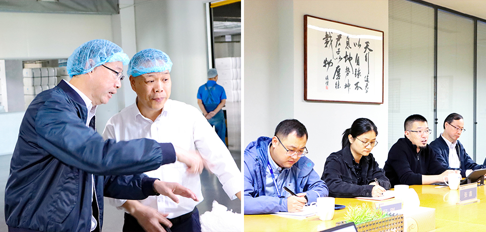 调研组专家一行在总经理龚金瑞的陪同下前往J生产线实地参观调研。期间,龚总详细介绍了我司产品的生产流程及工艺特色,并就智能制造、节能降耗等项目在产线的实践应用与专家组交流探讨。